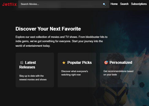 Developed a responsive streaming platform concept inspired by modern OTT services. The project features a clean interface, interactive content cards, smooth animations, and an adaptive layout designed to provide a seamless user experience across devices.